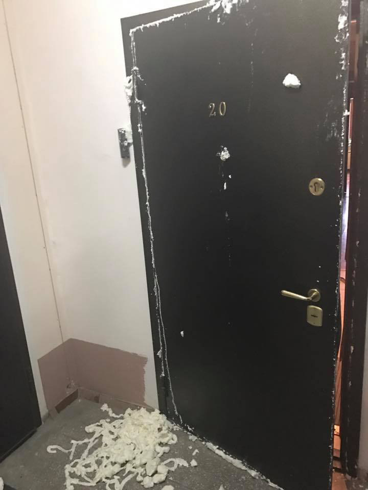 Двум сотрудницам штаба Навального запенили двери монтажной пеной, сообщил глава федерального штаба Леонид Волков в соцсетях. Как выяснилось впоследствии, монтажная пена оказалась не только в дверях, но и в автомобилях, которые еще и облили краской.