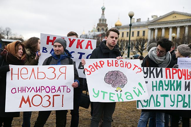Со стороны Троицкого моста подошла колонна из сотни человек с большой ярко-желтой растяжкой «Европейскому городу — Европейский университет». Этот негосударственный вуз городские власти пытаются выселить из старинного особняка в центре города. Студенты и преподаватели ходили во время акции по Марсову полю и веселились как могли. «Скажи, чтобы мозги вышли вперед!» — скомандовала коллегам девушка, державшая плакат «Нас ЕУ, а мы крепчаем». Юноша с плакатом, на котором изображен мозг с надписью «Закрывают? Утекай!», послушно вышел вперед. «Нас не приостановишь», — смеялись молодые люди и периодически скандировали: «Прочь руки от науки»!