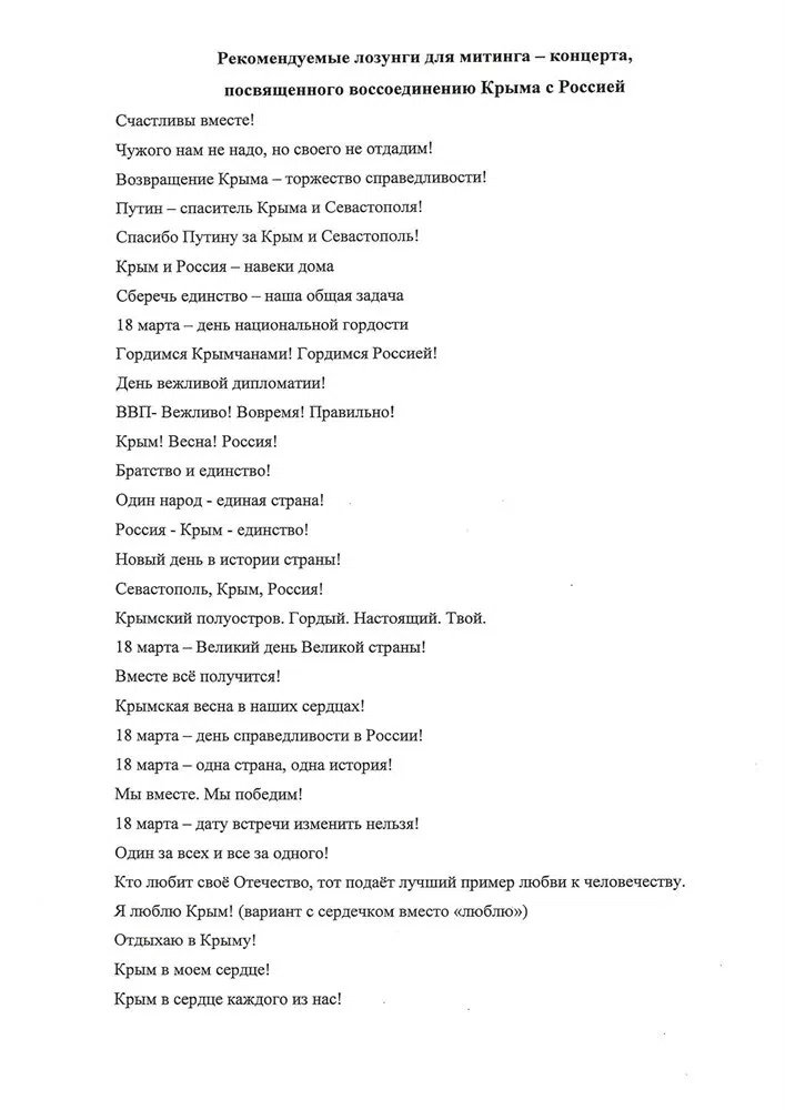В письме администрация указала список лозунгов, с которыми студенты должны были прийти на митинг, среди них были такие как: «Счастливы вместе!», «Путин — спаситель Крыма и Севастополя», «ВВП — Вежливо! Вовремя! Правильно!».