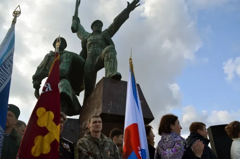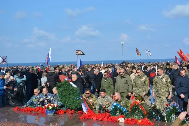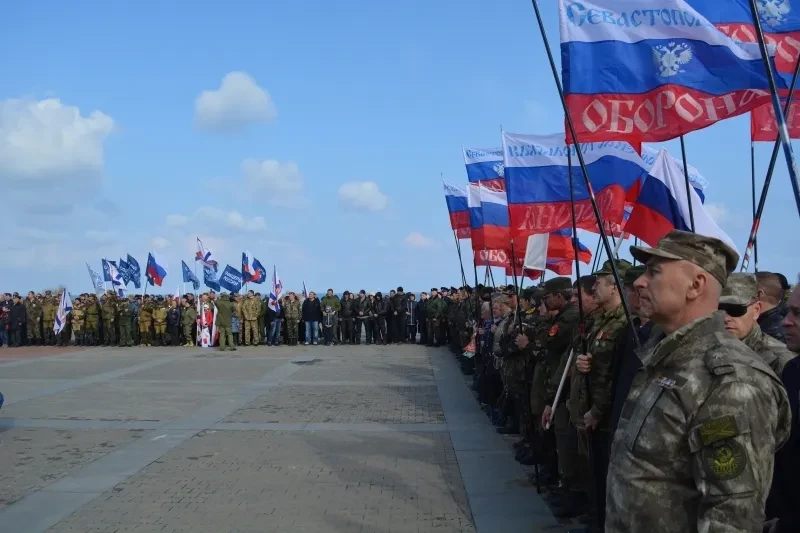 Пришедшие — преимущественно бойцы упраздненного ныне ополчения и казаки. Люди выстраиваются по периметру площади, растягивают транспаранты: «Севастополь без фашизма», «Крым с Россией расцветает, Украина с ЕС упала до Сомали». Появляются традиционные для патриотических праздников триколоры, имперские флаги и символика НОД.