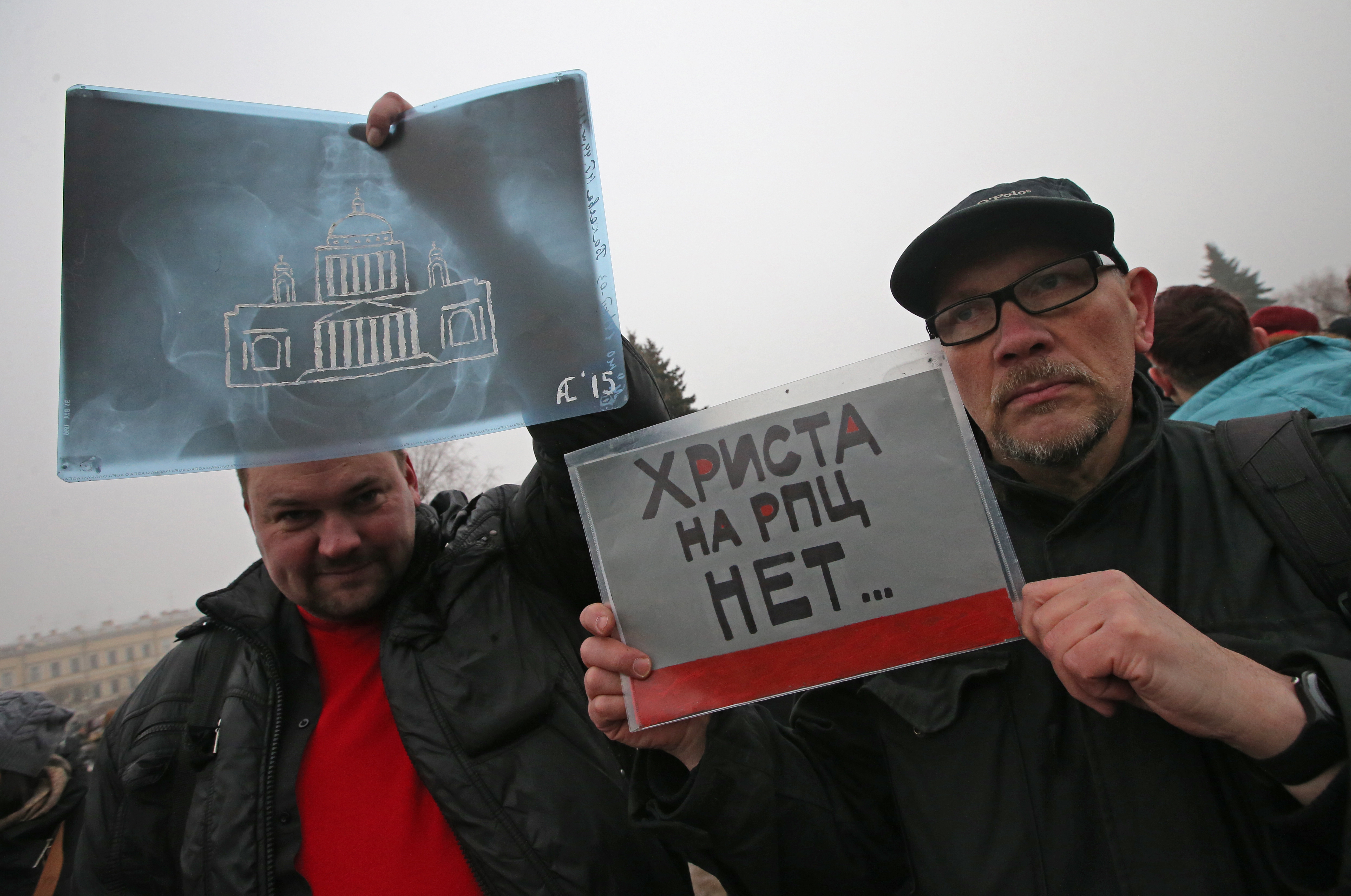 Акции протеста в Петербурге продолжаются уже несколько недель – после того, как стало известно, что власти города намерены передать Исаакиевский собор, сейчас находящийся в статусе музея, в ведение РПЦ. В резолюции сегодняшнего митинга говорится, что Исаакиевский собор должен остаться музеем.