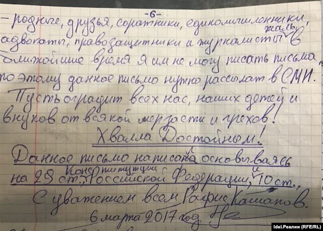 В 2015 году Рафис Кашапов был приговорен к 3-м годам лишения свободы с отбыванием наказания в колонии общего режима за то, что он высказал критические замечания в отношении политики Российской Федерации. Городской суд города Набережные Челны признал его виновным в возбуждении ненависти или вражды и в публичных призывах к осуществлению действий, направленных на нарушение территориальной целостности России. В своем письме Кашапов подробно описывает свое состояние и обстановку тюремной больницы.