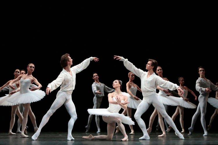 Попросту говоря, «Этюды» — это театрализованный экзерсис. Тот, с которого начинают рабочий день танцовщики всего мира. Порядок урока выверен тремя веками. Сначала — комплекс упражнений у палки (иначе говорят — у станка; заводские коннотации здесь вполне уместны). Затем те же упражнения — на середине зала, никто уже не держится одной рукой за станок. Затем большой блок вращений и прыжков. Логика: научись крепко стоять на ногах — и тогда сможешь летать, per aspera ad astra. Банальность, возведенная в степень высокой истины и высокого искусства.