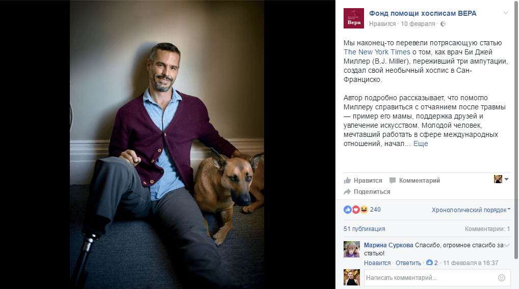 Пост на странице фонда помощи хосписам «Вера» с переводом статьи The New York Times собрал около 11 тысяч просмотров. Сотрудники фонда перевели материал о том, как врач Би Джей Миллер, переживший три ампутации, создал необычный хоспис в Сан-Франциско.