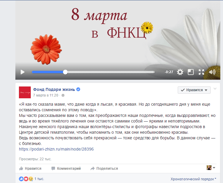 К 8 марта 2017 года на странице благотворительного фонда «Подари жизнь» был опубликован пост с видеороликом под названием «Красота как средство борьбы с болезнью». Сотрудники благотворительного фонда организовали фотосессию для трех пациенток Центра детской гематологии им. Димы Рогачева. Пост просмотрело более 30 тысяч человек. Помимо видеоролика читатели могли прочитать истории девушек и увидеть серию фотоснимков на сайте.
