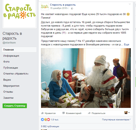 Наибольший охват получают посты-призывы о помощи. В декабре 2016 года фонд «Старость в радость» опубликовал запись со словами «не хватает новогодних подарков для домов престарелых». «Эта запись с элементом паники. В итоге – 367 тысяч охвата и 57 тысяч кликов на публикацию без оплаты рекламы», – рассказала Александра Кузьмичева. Также одним из успешных постов фонда стала историю про бабушку в глухой деревне, которой пытались заказать цветы с доставкой.