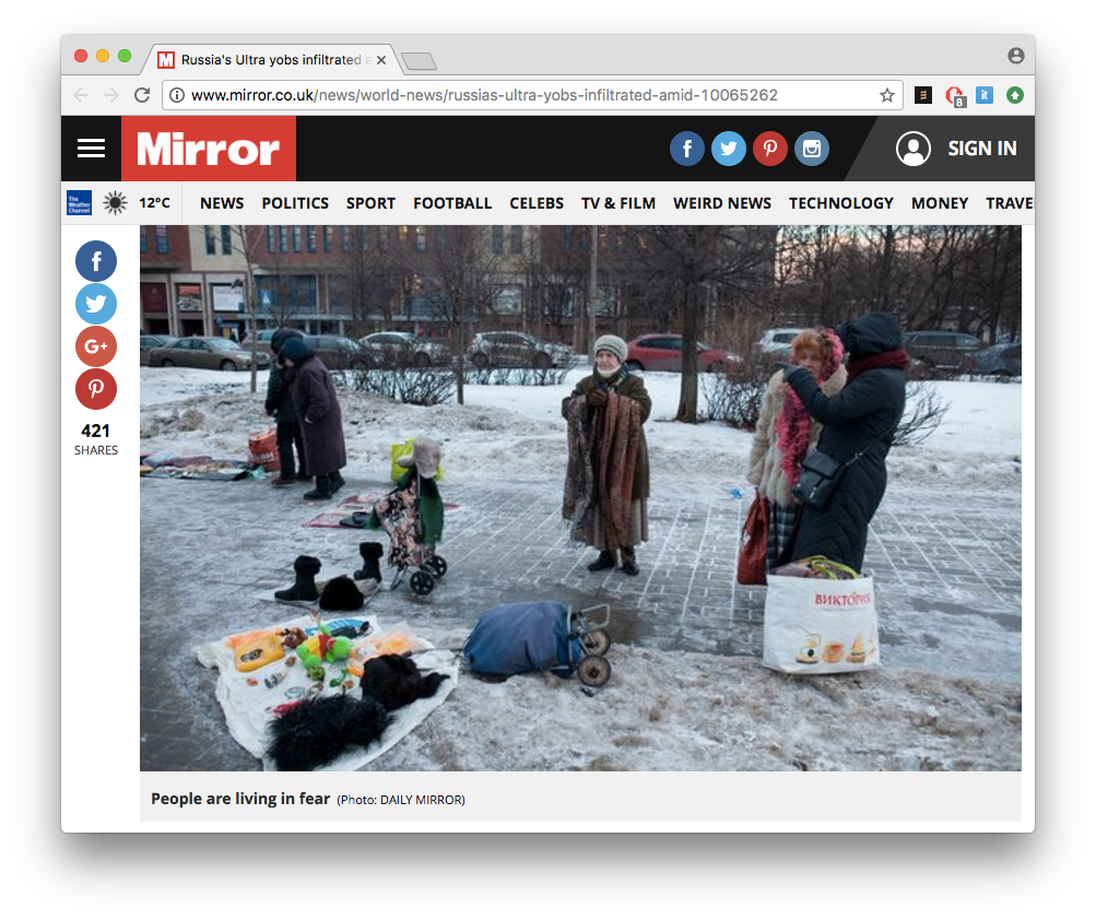 Издание проиллюстрировало материал видео с соревнования по кулачному бою, который прошел в Измайловском парке на Масленицу. The Daily Mirror называет мужчин в народных костюмах «ультрас», которые «демонстрируют, насколько жестокими они могут быть».