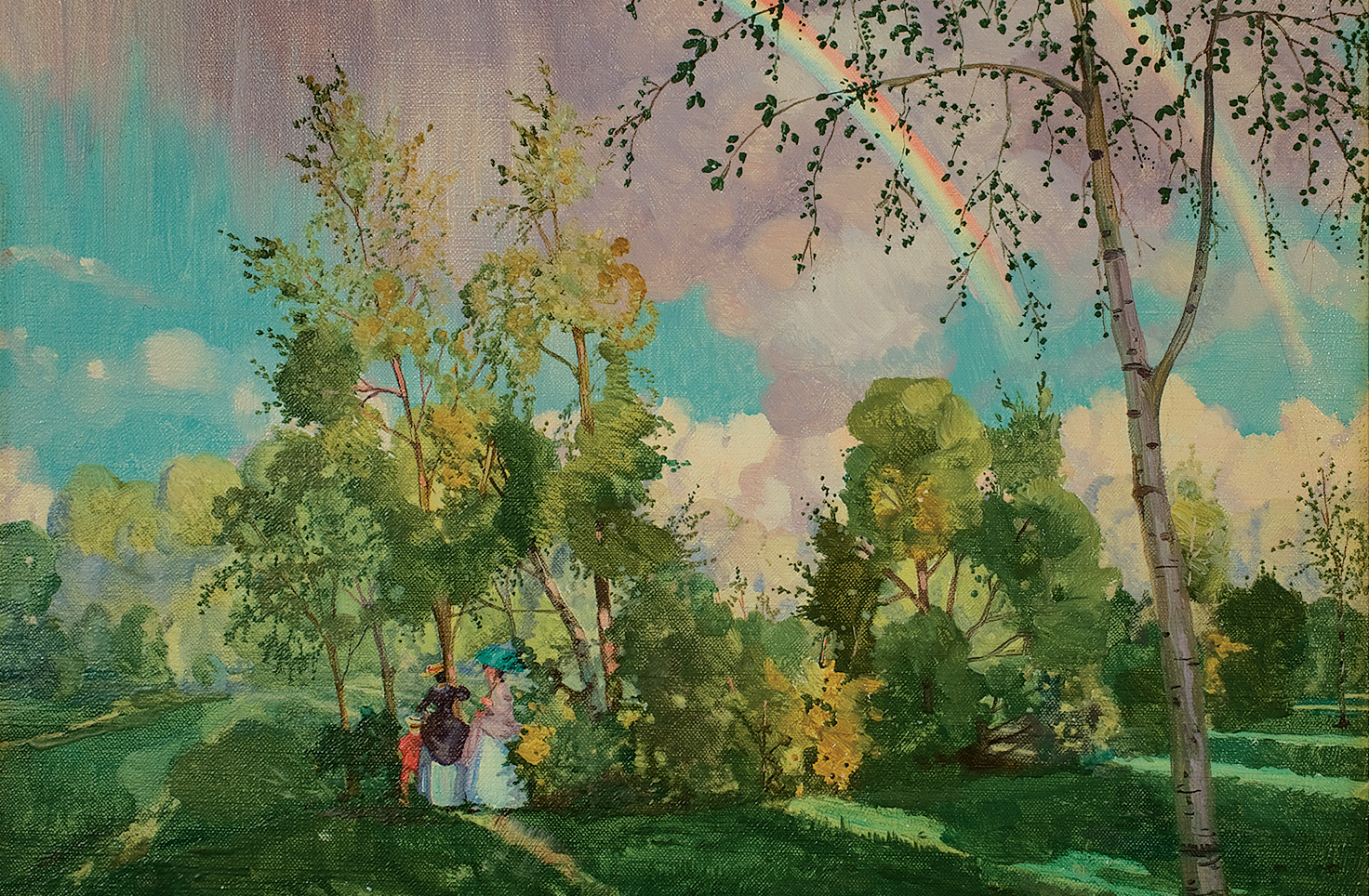Обе работы — хрестоматийный Сомов, именно тот, что подразумевается под его брендом. «Пастораль» — фривольная картинка: в райских кущах справный парень щупает дремлющую барышню при свете лубочного заходящего солнца. «Радуга» — ностальгическое полотно: в березках, спиной к зрителю, глядя в заливные луга, стоит компания из двух женщин и ребенка, а над ними висит мокрая акварельная радуга. Фривольность и меланхоличная ностальгия — узнаваемые слагаемые сомовской поэтики. Вопрос только в том, что из них складывается. То, что для «мирискусников» было «тоской по мировой культуре», для их внуков обернулось светлой печалью по дореволюционному быту, а для наших современников стало предметом роскоши.