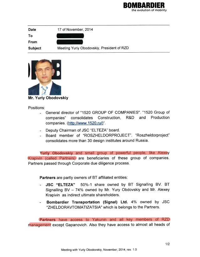 В документах, направленных шведской полицией в суд, есть внутренняя переписка сотрудников «Бомбардье транспортейшн», которые упоминают имена Юрия Ободовского и Алексея Крапивина.