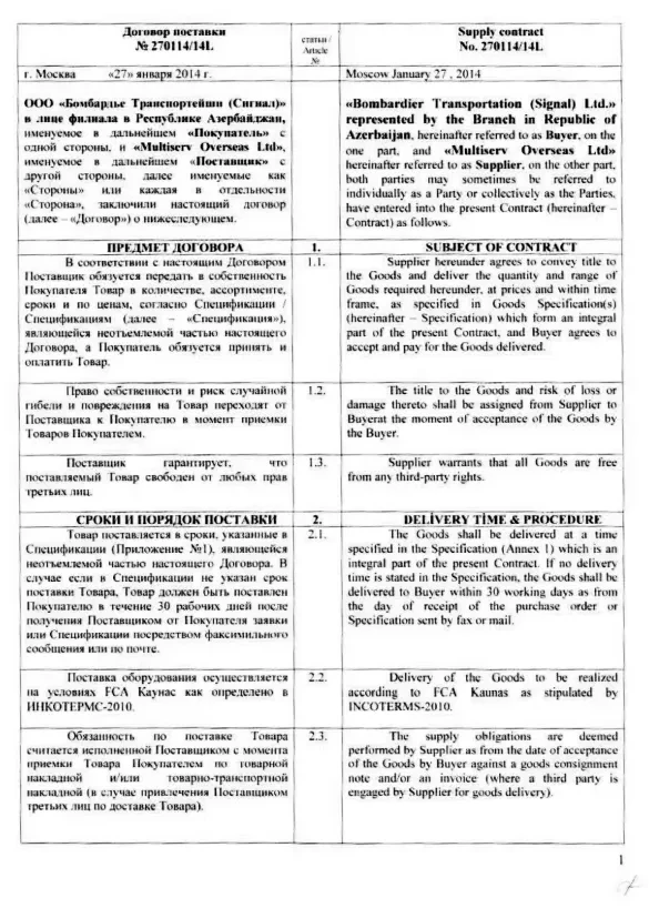 В распоряжении «Новой газеты» есть четыре контракта, которые, как мы полагаем, относятся к одной сделке по поставке оборудования в Азербайджан. В ходе сделки шведское отделение «Бомбардье» продает оборудование своей российской «дочке» через фиктивную британскую компанию, на счетах которой оседают значительные средства, а оттуда деньги переводят в офшорные юрисдикции по контрактам, которые несколько экспертов назвали «фиктивными». Стоимость оборудования для Азербайджана таким образом увеличивается в 5 раз.