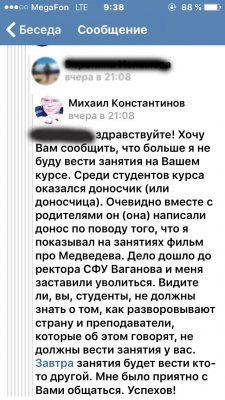 Михаила Константинова, преподавателя кафедры Гуманитарных наук уволили из Сибирского федерального университета. Это случилось после того, как он показал студентам документальный фильм Фонда борьбы с коррупцией «Он вам не Димон». Об этом изданию «Проспект Мира» сообщили студенты.