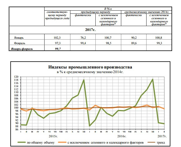 Индексы промышленного производства в публикации Росстата gks.ru Кроме того, в феврале 2017 года, подсчитал Росстат, реальные располагаемые денежные доходы населения снизились на 4,1% по сравнению с аналогичным периодом 2016 года.