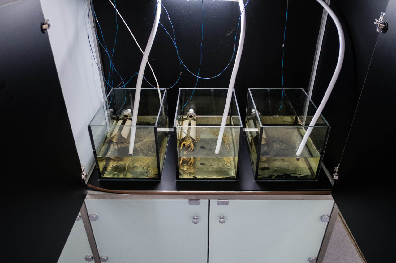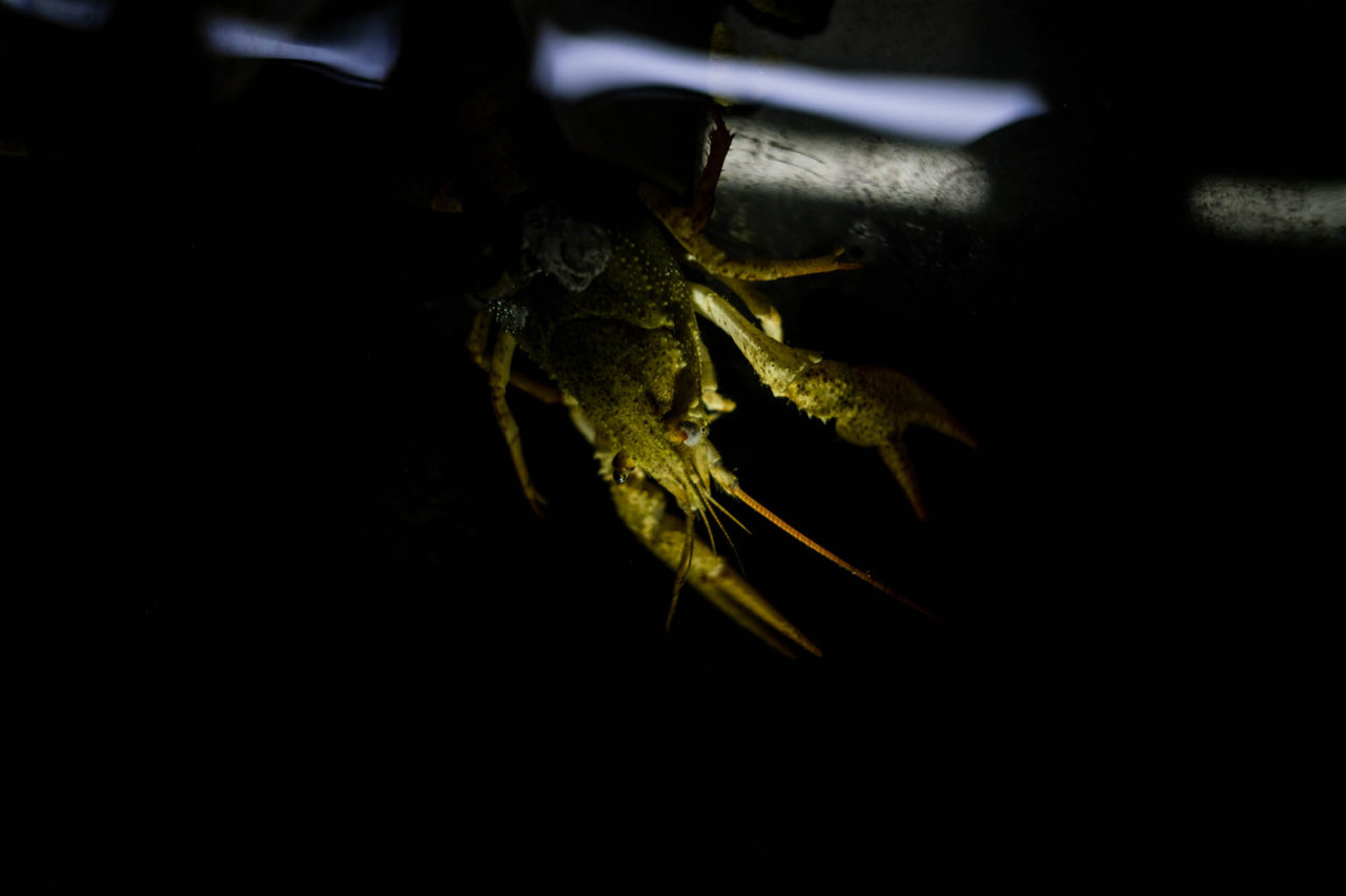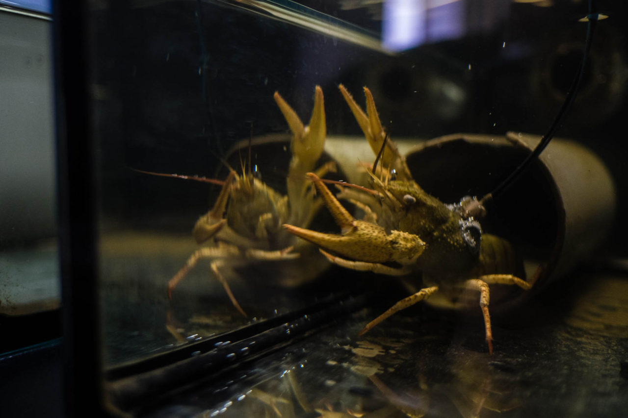 Когда мы пришли, все шесть рабочих мест казались пустыми. Раки, закрыв глаза, дремали, забившись в свои норы. Пока мы с глуповатым видом стучали по одному из аквариумов в надежде привлечь внимание спящего диагноста, посмотреть, что же происходит, выполз обитатель «кабинета» этажом ниже. Раков особо обаятельными животными не назовешь — не котики. Но этот неожиданно устроил показательные выступления, стал позировать фотографу. Подползал поближе, то анфас, то профиль. Хотел понравиться. Потом махнул клешней и тоже скрылся в норе.