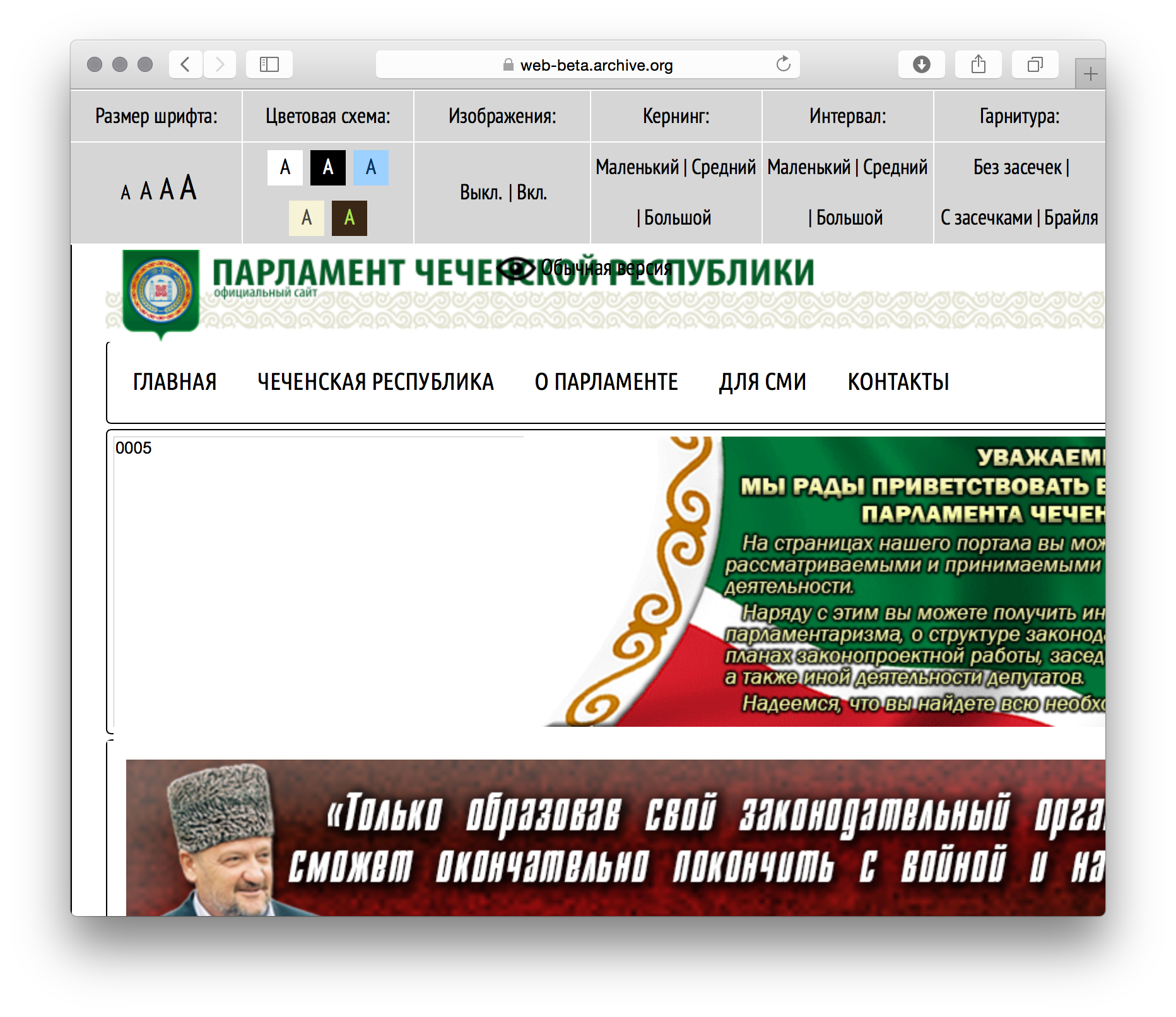 23 марта выяснилось, что на сайте чеченского парламента можно выбрать шрифт Брайля, созданный для незрячих. В существовании такой версии сайта нет никакого смысла, поскольку шрифт Брайля предназначен для чтения наощупь.