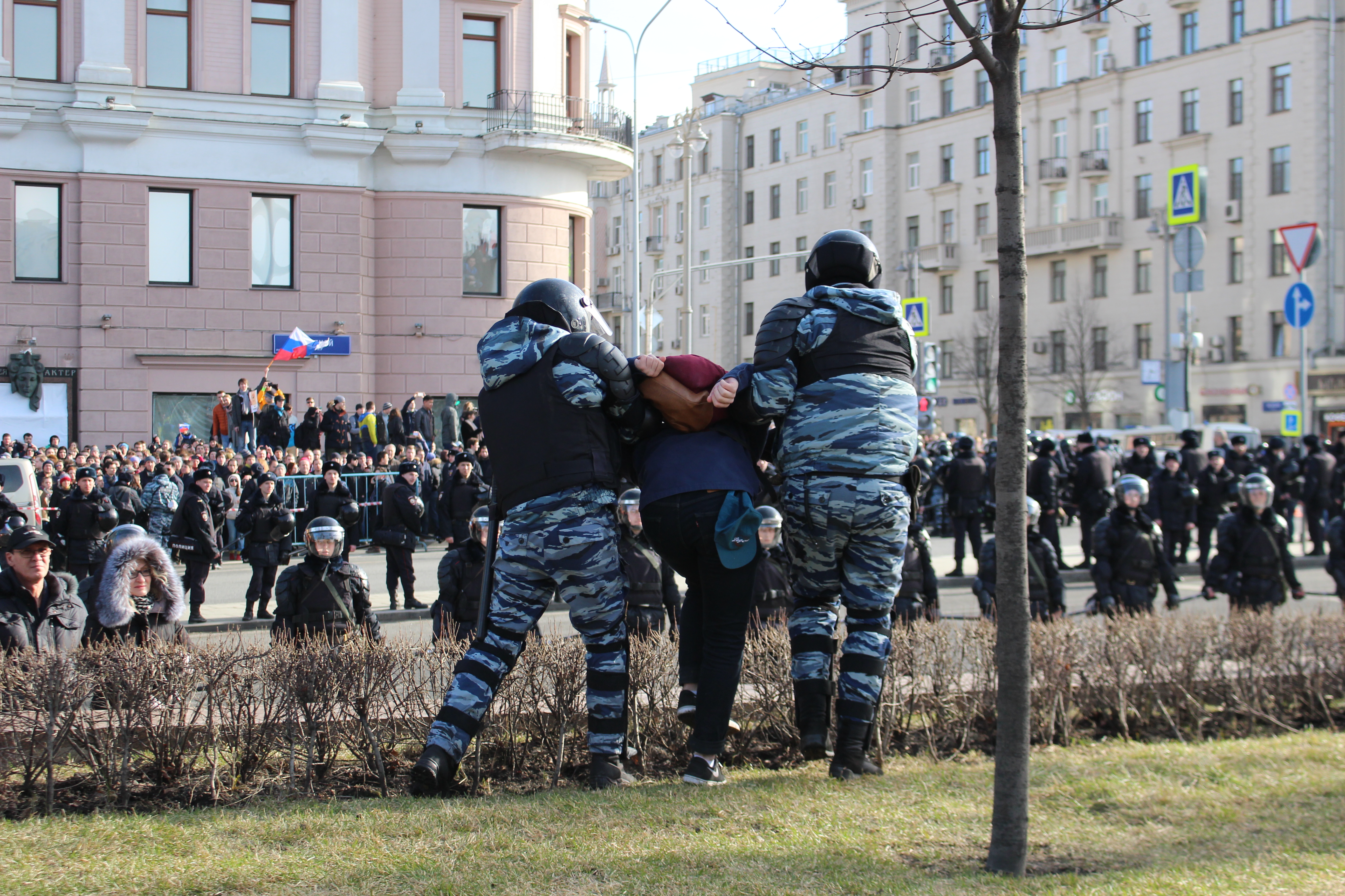 Задержание на антитеррористическом митинге Фото: Мария Решетникова Между тем в Санкт-Петербурге полицейские поначалу не препятствовали участникам митинга на Марсовом поле, несмотря на то, что он не был согласован с властями города в соответствии с требованиями законодательства о проведении массовых мероприятий. Затем появились сообщения, что незадолго до начала митинга были задержаны два активиста.