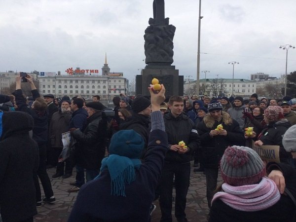 Участники митингов в разных городах вышли не только с плакатами, но и желтыми уточками – символом антикоррупционных расследований ФБК, который стал таковым после публикации Фондом Навального в сентябре 2016 года видео с «секретной дачей» Медведева в Плесе, которая стоит, по утверждению авторов ролика, не менее 25-30 млрд рублей.