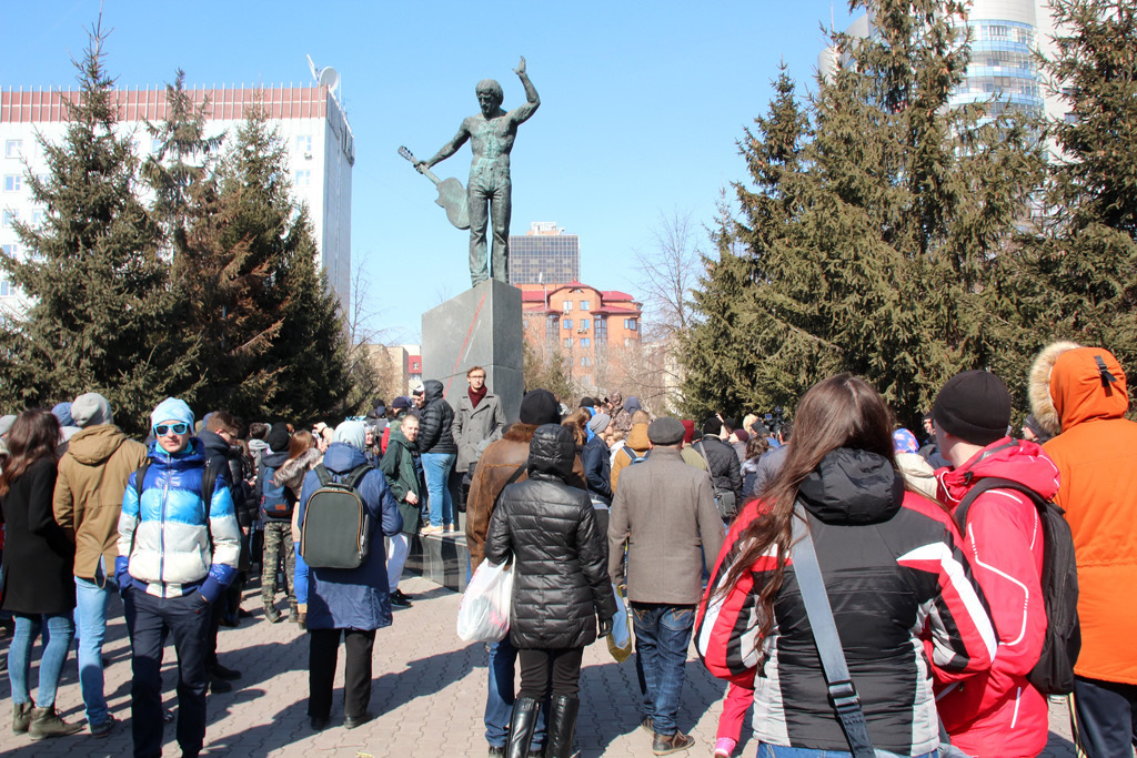 Выступления организаторов немного задержали, чтобы дождаться тех, кто не знал последних новостей о выигранном суде и пришел в Первомайский сквер. В конце концов деревянные ограждение пришлось убрать, чтобы вместить всех желающих — часть тут же забрались на постамент Высоцкому.