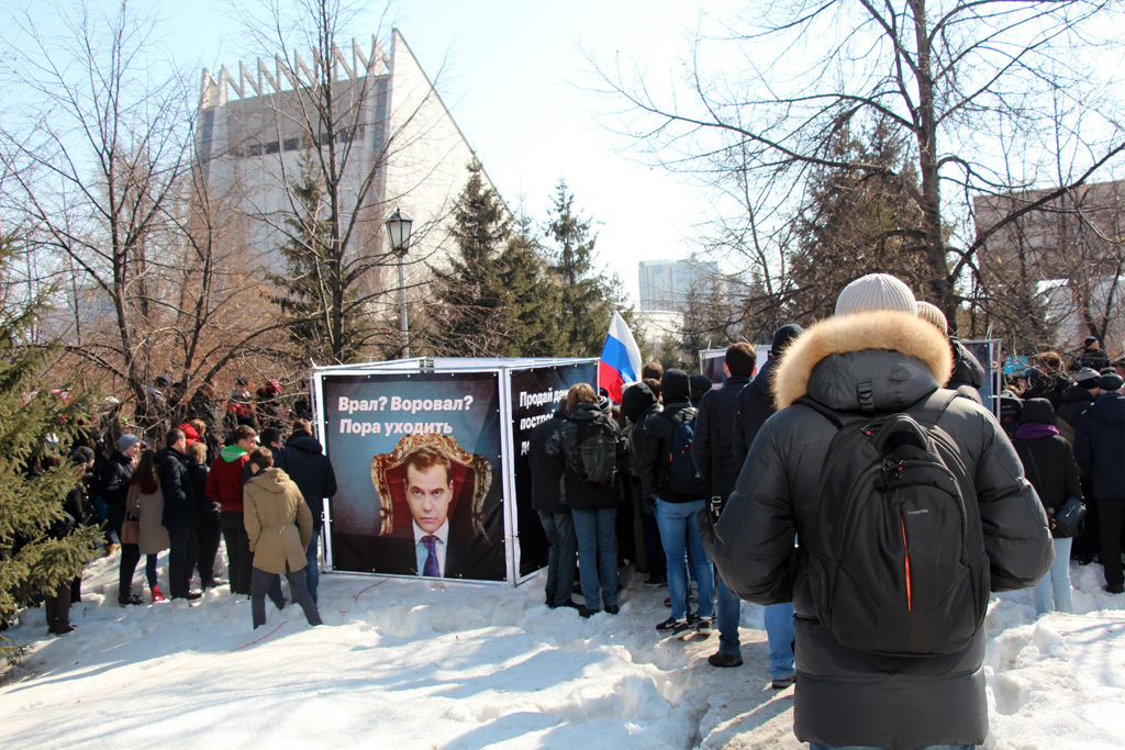 Из-за небольшого пространства для митинга кубы с изображением Дмитрия Медведева и надписями про «коррупцию» пришлось поставить на снег. На аллее же собралось, по оценкам Тайги.инфо, не меньше 2 тыс. человек.