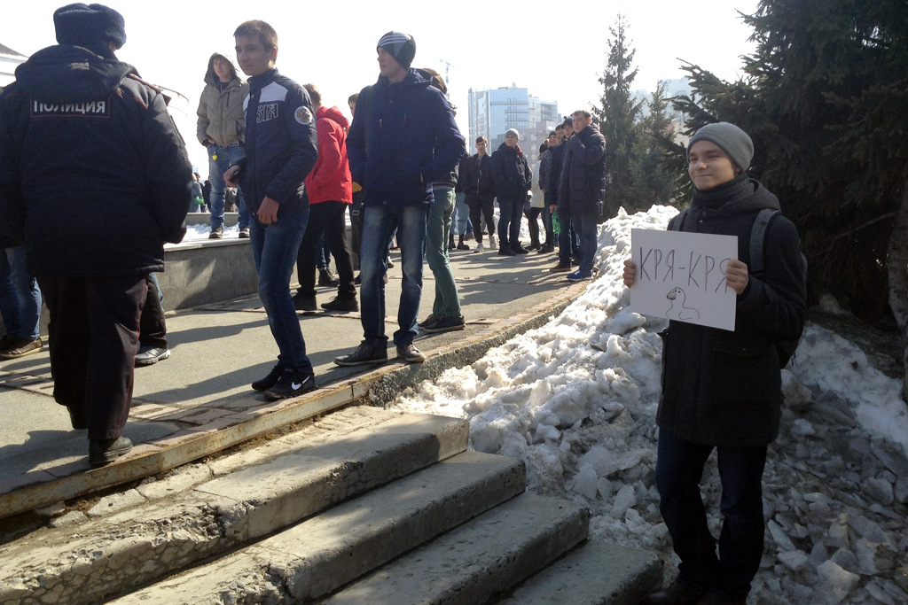 До начала акции около 300 человек стояли у фонтана перед «Глобусом», где и предполагался митинг. Один из координаторов действий полиции попросил подчиненных «поработать у фонтана, чтобы не было никаких плакатов». К тому времени только один парень успел развернуть плакат, на котором было написано «Кря-Кря». Полицейские прошли мимо.