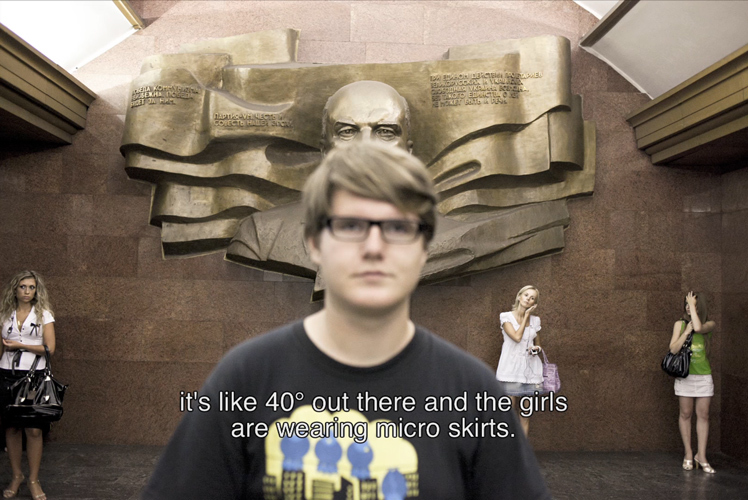 Воображаемая Украина представлена фотографиями современного Минска, населенного девушками по имени Екатерина. «Екатерина, Екатерина, Екатерина…» — до изнеможения повторяет страдающий герой, вываливая на зрителя тонны снимков блондинок в «микроюбках» и в будуарах. Рефрен звучит так настойчиво, что перестает восприниматься как имя человека. Бинго! Именно этого эффекта фотограф и добивался: ведь визуальный дневник — история Ромена не о девушках, любви и счастливом «хеппи-энде» на обломках империи. Проект о нем и только о нем — обеспеченном белом мужчине с Запада, заставляющем весь мир вертеться вокруг его сексуального желания. Екатерина, Ирина, Наташа — он же ясно дает понять, что ему неважно, как зовут длинноногое существо женского пола. Та, которая «из “Пятого элемента”! Рыженькая!» Милла-Екатерина. Вам еще не смешно? Ну, это искусство не для вас.