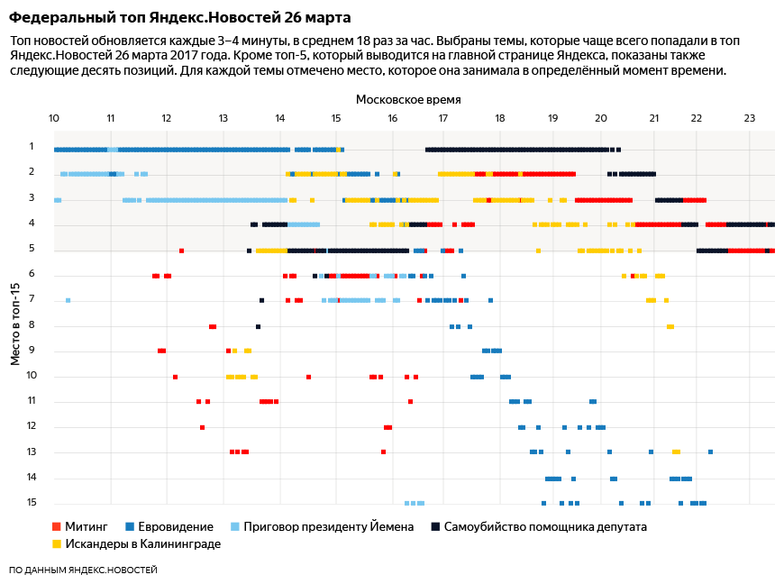 Главным сюжетом первой половины дня на "Яндекс.Новостях" было Евровидение, начиная с половины пятого вечера, в пик задержаний протестующих в Москве и Петербурге, на первую строчку топа вышел сюжет о самоубийстве помощника депутата Госдумы. Ближе к вечеру главным сюжетом московских "Яндекс.Новостей" стала погода. Суд над Алексеем Навальным в первой половине дня в понедельник также не попал на верхние строчки топа агрегатора (сюжет вышел на первое место только после приговора по второму делу).