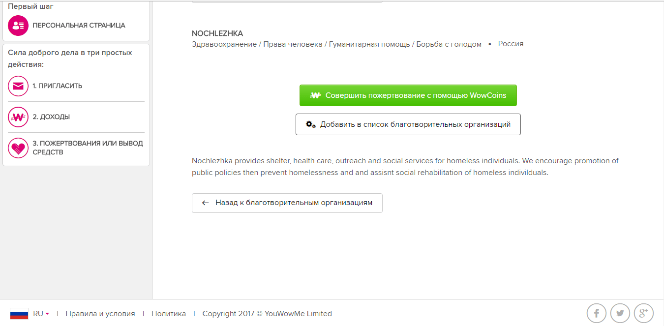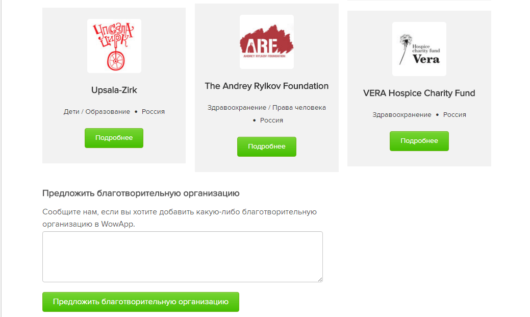 В личном кабинете на странице WowApp есть раздел «Сила доброго дела», а в ней рубрика «пожертвования и вывод средств». При выборе вида благотворительности пользователь попадает на страницу со списком российских фондов. Есть возможность настроить автоматическое пожертвование. В списке 18 НКО, среди них фонд помощи хосписам «Вера», благотворительные организации «Ночлежка», «Шаг навстречу», социальный проект «Упсала Цирк», фонды «Димина мечта», «Здесь и сейчас» и другие. Пользователь вправе сам предложить благотворительную организацию для включения в список.