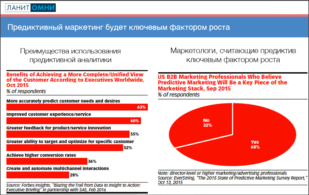 К примеру, по информации консультативной американской компании Everstring, 68% маркетологов считают, что предиктивная аналитика – это ключевой фактор роста. А по данным Forbes insights, 63% убеждены, что именно такой метод помогает предсказать желания и потребности клиентов.