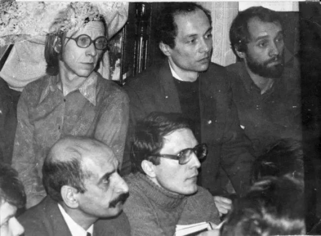 Встреча редакторов самиздатских журналов в квартире Сергея Григорянца. 1988 год. Стоят (слева направо): Кирилл Попов, Кирилл Подрабинек, Александр Подрабинек. Сидят: Сергей Григорянц, Сергей Лёзов