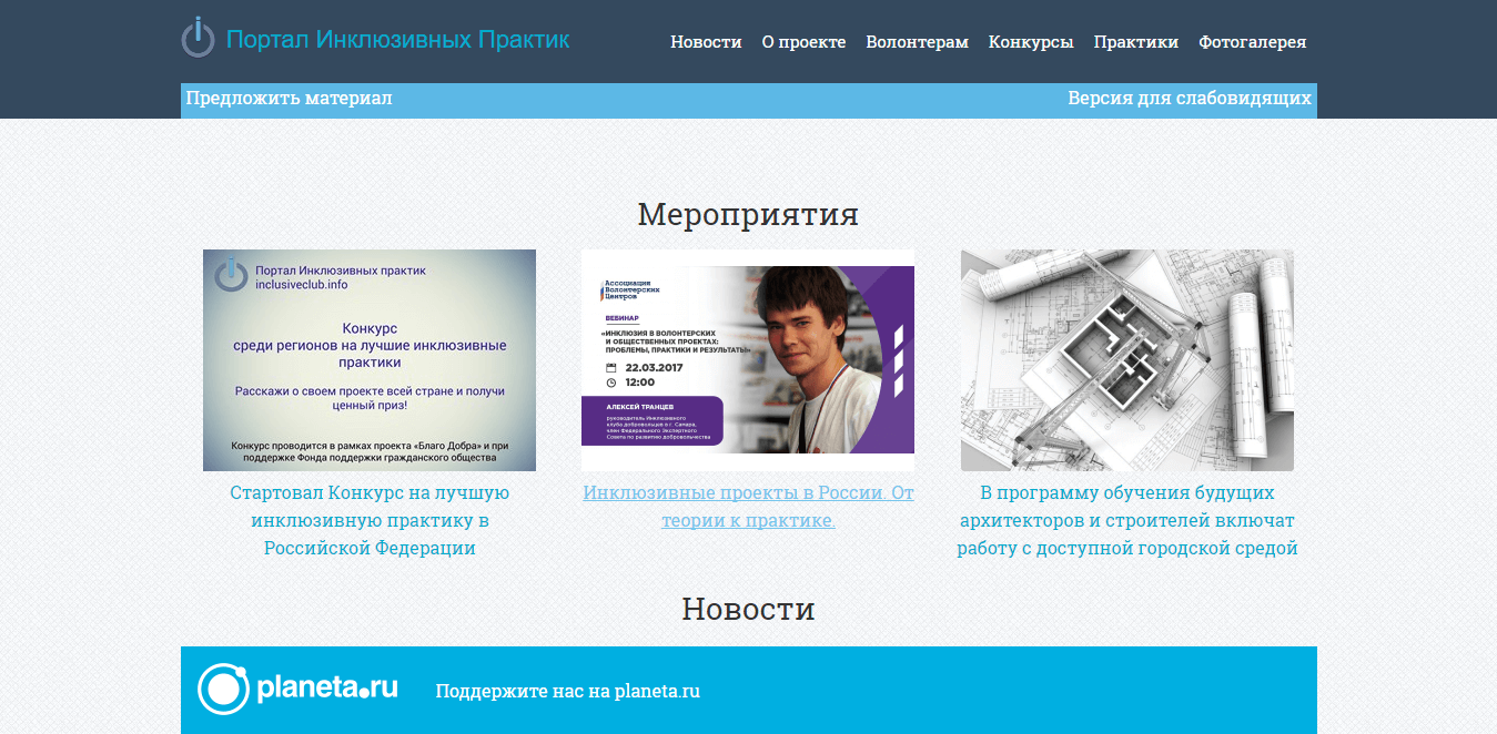 На портале инклюзивных практик есть несколько рубрик: «новости», «волонтерам», «конкурсы», «практики» и «фотогалерея». На сайте публикуются анонсы различных событий: от межрегиональных форумов до семинаров, информация о конкурсах, акциях для волонтеров.