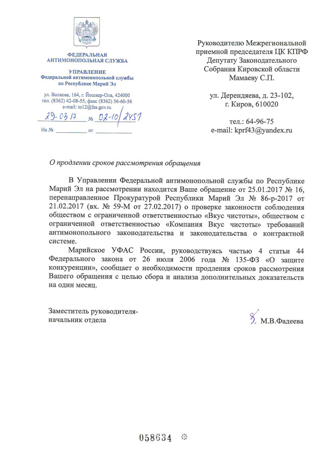 29 марта 2017 года заместитель руководителя УФАС по Республике Марий Эл в официальном ответе руководителю Межрегиональной приемной Председателя ЦК КПРФ Геннадия Зюганова сообщила, что идет проверка соблюдения законности ООО “Вкус чистоты” и ООО “Компания Вкус чистоты” требованиям антимонопольного законодательства и законодательства о контрактной системе.