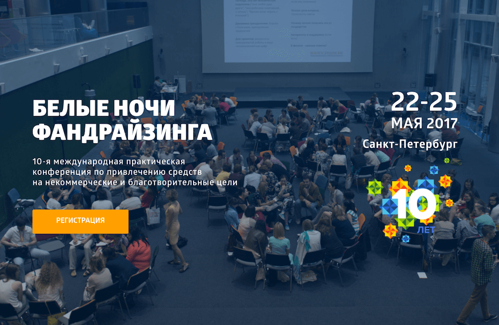 Международная конференция «Белые ночи фандрайзинга» пройдет с 22 по 25 мая 2017 года в Санкт-Петербурге. Принять участие будет полезно сотрудникам и руководителям некоммерческих организаций, фандрайзерам, грантодателям, донорам и социальным предпринимателям. В этом году событие состоится уже в десятый раз.