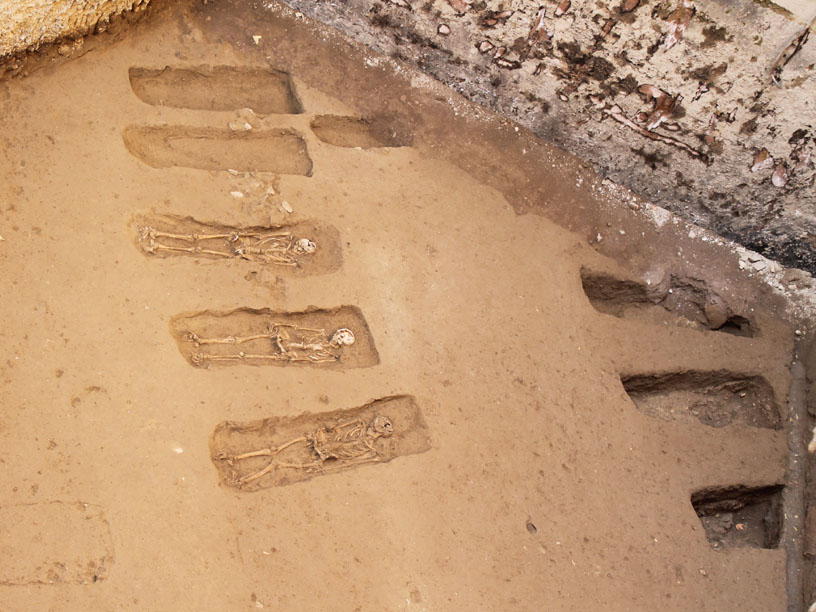 Археологи нашли фрагменты деревянных гробов и железные гвозди, а также хорошо сохранившиеся скелеты погребенных: взрослых мужчин и женщин. Изучение костей показало, что эти люди при жизни испытывали недоедание и дефицит белка, следовательно, они принадлежали к бедным слоям общества. Только у двух похороненных там женщин имелись небольшие золотые кольца, других украшений не было.