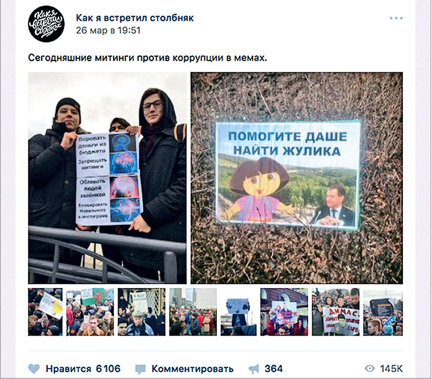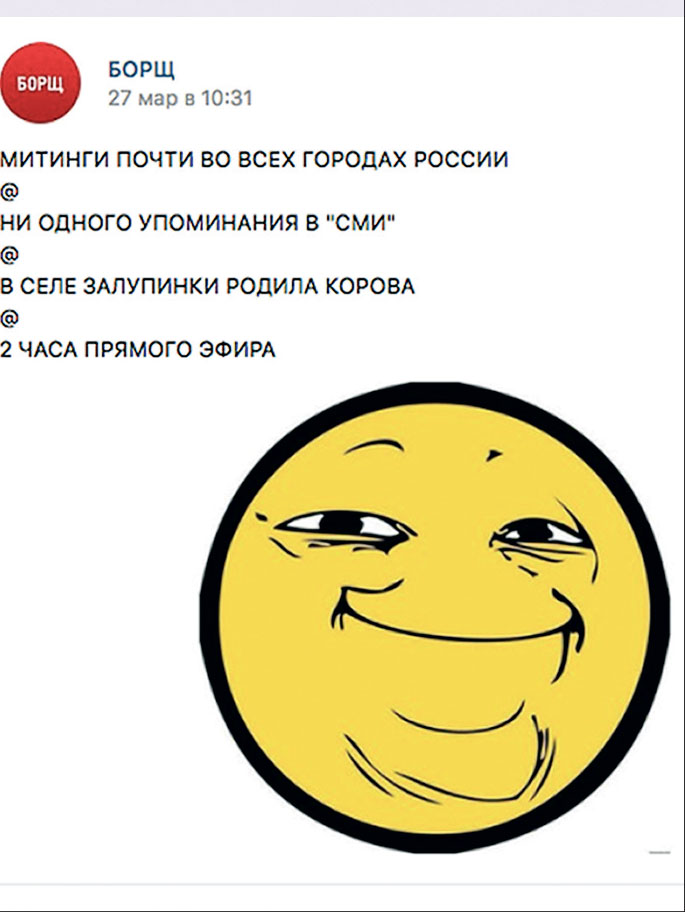 Источник любого мема в интернете всегда трудно, если вообще возможно, найти. Митинг 26 марта стал мемом, еще не начавшись, и найти единственного ответственного за это уже невозможно. Тем не менее факт остается фактом: уже с утра воскресенья 26 марта десятки крупнейших неполитических пабликов в сети «ВКонтакте» начали выкладывать призывы выйти на улицу и шутки про Дмитрия Медведева. Это не было спланированной акцией, как нам обязательно попытаются объяснить охранители. Это было то, что лучше всего описывается емким и нерусифицируемым термином «хайп». Огромные медиа с аудиторией в миллионы человек, существующие вне поля зрения конвенциональных СМИ, новостных агрегаторов, телевидения и медиааналитиков, вдруг одно за другим подхватили тему митинга.