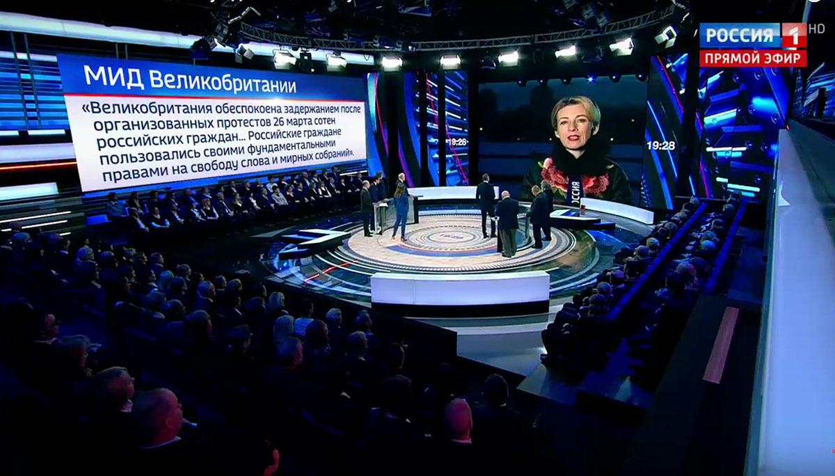 В воскресенье 26 марта, когда, по самым скромным подсчетам, на улицы российских городов — от Владивостока до Калининграда — вышли более 60 тыс. человек, государственные СМИ их не замечали. Митинг в Москве в прямом эфире освещало только одно государственное издание — не предназначенный для русскоязычной аудитории, англоязычный сайт телеканала Russia Today.