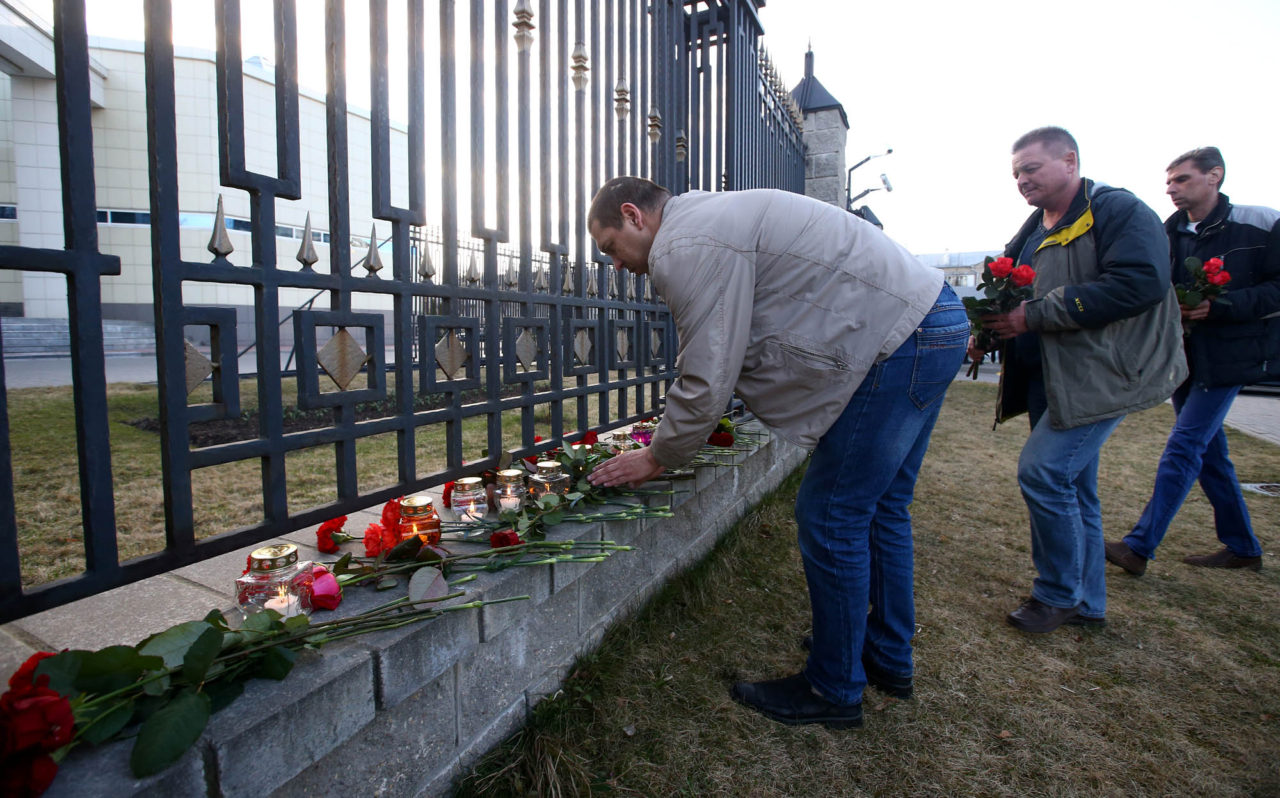 Мужчины возлагают цветы у посольства России в Минске