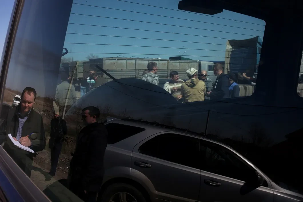 Группа активистов идет уточнить, за что сотрудники ДПС останавливают грузовики. Полицейские в растерянности — говорят, что просто документы проверяют по базе. После десятиминутной перепалки четыре КАМаза от ООО «Азовзернотранс» пропускают. Еще через полчаса въезд на парковку перегораживает трактор.