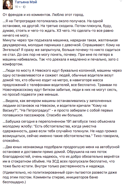 Я провел только один рейс — с работы на «Горьковской» до Комендантского. Говорить особо не хотелось, день такой. Но всё же перекинулись парой дежурных фраз: «А на „Востания“, вроде, бы килограмм [тротила] целый!» «Ага…». В конце попрощались и пожелали друг другу здоровья и благополучия. Это и был самый теплый момент. Люди стали чуть ближе, забыли о постоянной беготне, заработке, мелочных проблемах. Помогать нужно обязательно. Каждый день, не только в темный.