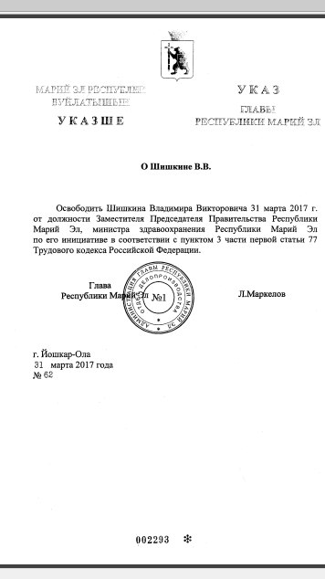 31 марта 2017 года Министр Здравоохранения Марий Эл, господин Шишкин был уволен со своего поста с формулировкой «по собственному желанию».