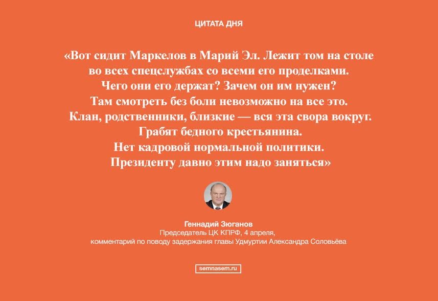 Председатель ЦК КПРФ Геннадий Зюганов 4 апреля прокомментировал журналистам задержание главы Удмуртии Александра Соловьёва. Зюганов говорил не столько о Соловьёве, сколько вообще о последних тенденциях во власти: «Исполнительная власть без контроля или сопьется, или проворуется, или с ума сойдет». Упомянул лидер коммунистов и главу Марий Эл Леонида Маркелова.