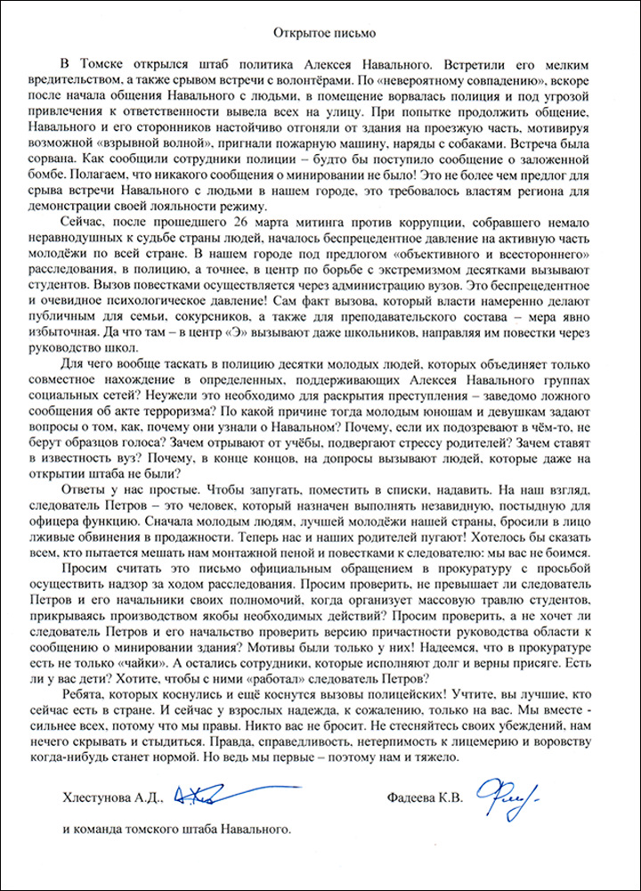 Она и руководитель штаба Алена Хлетунова опубликовали в СМИ открытое письмо с призывом обратить внимание на действие томской полиции и работу замначальника Центра по противодействия экстремизму регионального УМВД Дмитрия Петрова.