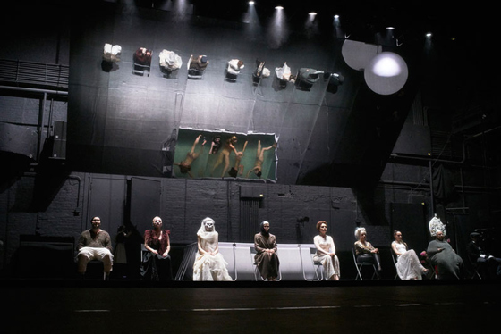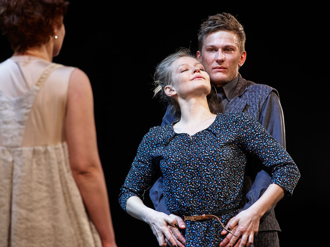 © С.Петров / Театр Наций В начале второго акта в спектакле появляется Дикой, роль которого здесь урезана почти до камео. Играет его Виталий Кищенко — Борис в первой марчеллиевской «Грозе», поставленной семнадцать лет назад в «Тильзит-театре». Но скабрезный танец, который Дикой танцует перед Кабанихой, из другого спектакля — и он узнается на раз. Этим, извините, тверкингом Жан из «Фрекен Жюли» Марчелли подавал недвусмысленные знаки своей госпоже. Кабаниха на сей раз реагирует спокойно, намекая, что такие забавы ей и не по возрасту, и не по рангу. Но болезненный дух стриндберговской пьесы просачивается в «Грозугрозу» — вместе с темой запоздалой женской инициации. Юлия Пересильд с блеском играет эмоциональные амплитуды своей героини: скованность перед Кабанихой, лихорадочное оживление в сцене с Варварой, к которой Катя придвигается, пожалуй, даже слишком близко. С наигранной веселостью и особенным острым интересом Катя интересуется у Варвары, девушка ли она. В невротическом ступоре, лежа, выслушивает монолог Вари, принесшей ей ключ от беседки. А видение утопленниц-русалок, читающих мрачные пророчества полусумасшедшей Барыни, вызывает у Кати пароксизм страха. Русалки эти похожи то ли на гламурных моделей, то ли на девушек полусвета — Катя до смерти боится порока. Ее инициация Борисом (реальным или воображаемым) заканчивается «грозой»: ни грома, ни молнии, только жиденькая влага, потекшая из-под колосников. И тут же, без паузы, Катино признание в грехе — звучащее не столько покаянием, сколько констатацией неубиваемой женской природы, требующей плотской любви. И долгая немая сцена: обнаженные тела совершают неосмысленные механические движения. Post-orgasmic chill.