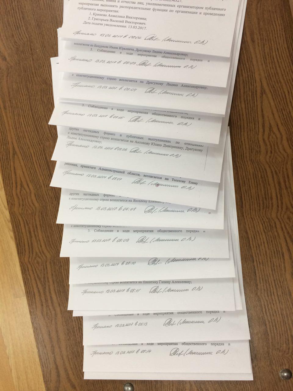 Если верить подписям на полях, все уведомления были поданы 13 марта, ещё до того, как Навальный призвал народ выходить на улицу. В управлении внутренней политики их зарегистрировали в первые же минуты рабочего дня. Первое уведомление поступило в 9:02, второе — в 9:03 и так далее, с разницей в одну минуту до 9:14 включительно. Итого 12 уведомлений за ЗОЖ было принято за 12 минут — потрясающую оперативность проявили и сами заявители, и сотрудники УВП, и, главное, тот старик, который регистрирует посетителей в бюро пропусков областной администрации.