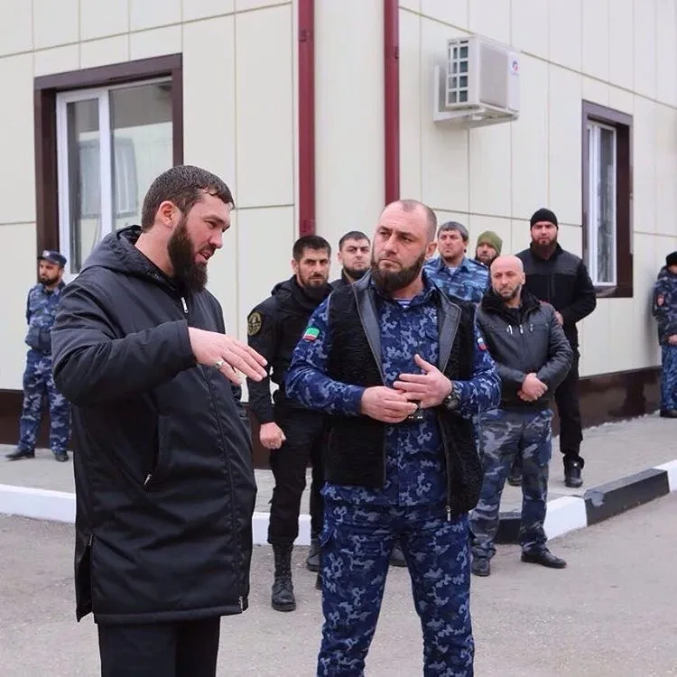 Эту фотографию «Новая» затем нашла в Инстаграме Аюба Катаева, начальника ОМВД России по городу Аргуну. На фоне сотрудников чеченской полиции четко видны двое: спикер парламента Чечни Магомед Даудов (более известный по своему позывному «Лорд») и сам начальник ОМВД по Аргуну Аюб Катаев. Фотография была размещена в Инстаграме 7 марта.
