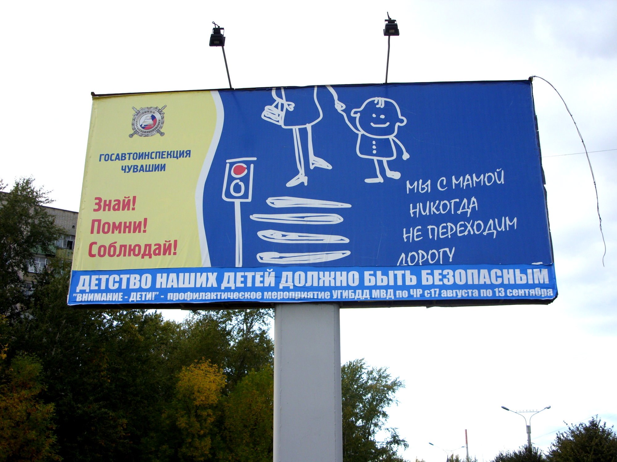 Баннер в Чебоксарах рядом с перекрёстком на ул. Хевешская и Эгерского бульвара. Госавтоинспекция Чувашии: «Знай! Помни! Соблюдай! Мы с мамой никогда не переходим дорогу!».