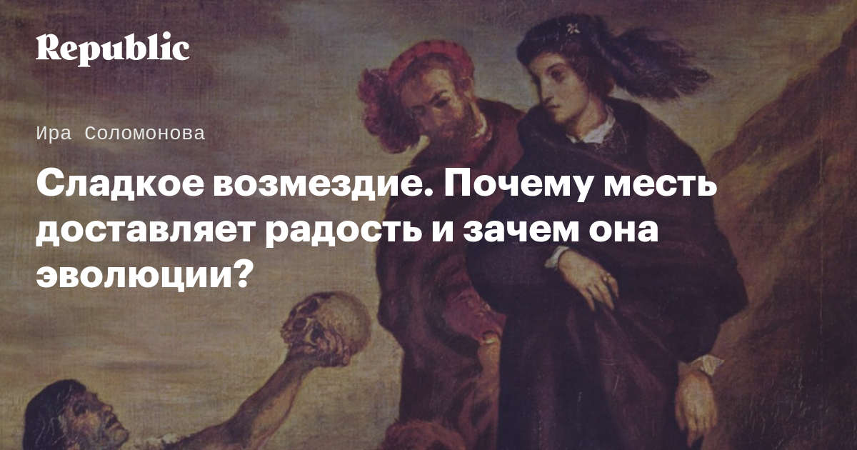Говорят, что месть сладка. Большинство из нас, пострадав, испытывает желание сделать что-то нехорошее обидчику, даже если это близкий человек: нам кажется, что это как-то компенсирует полученный негатив. Судя по истории мировой культуры, так люди вели себя всегда – достаточно вспомнить «Илиаду» Гомера или «Гамлета» Шекспира. Откуда берется в человеке желание побыть «плохим парнем» в ответ на обиду, что происходит в нашем мозге, когда мы думаем о мести, и чем мстительность может быть полезна обществу?