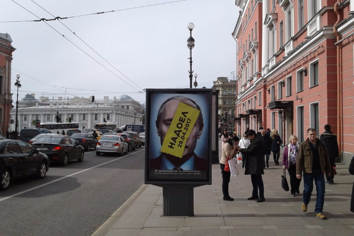 Днем 7 апреля на Невском проспекте в Петербурге повесили плакат с портетом Владимира Путина и надписью «Надоел».