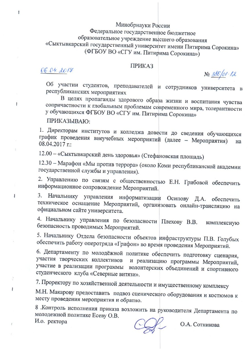 Руководство Сыктывкарского государственного университета разослало руководству своих институтов и старостам групп приказ об участии студентов и преподавателей в планируемых 8 апреля мероприятиях. Это «День здоровья» и марафон «Мы против террора», которые пройдут на Стефановской площади и площадке перед Коми государственной академией госслужбы и управления. Журналистам «7x7» документ передал студент вуза.