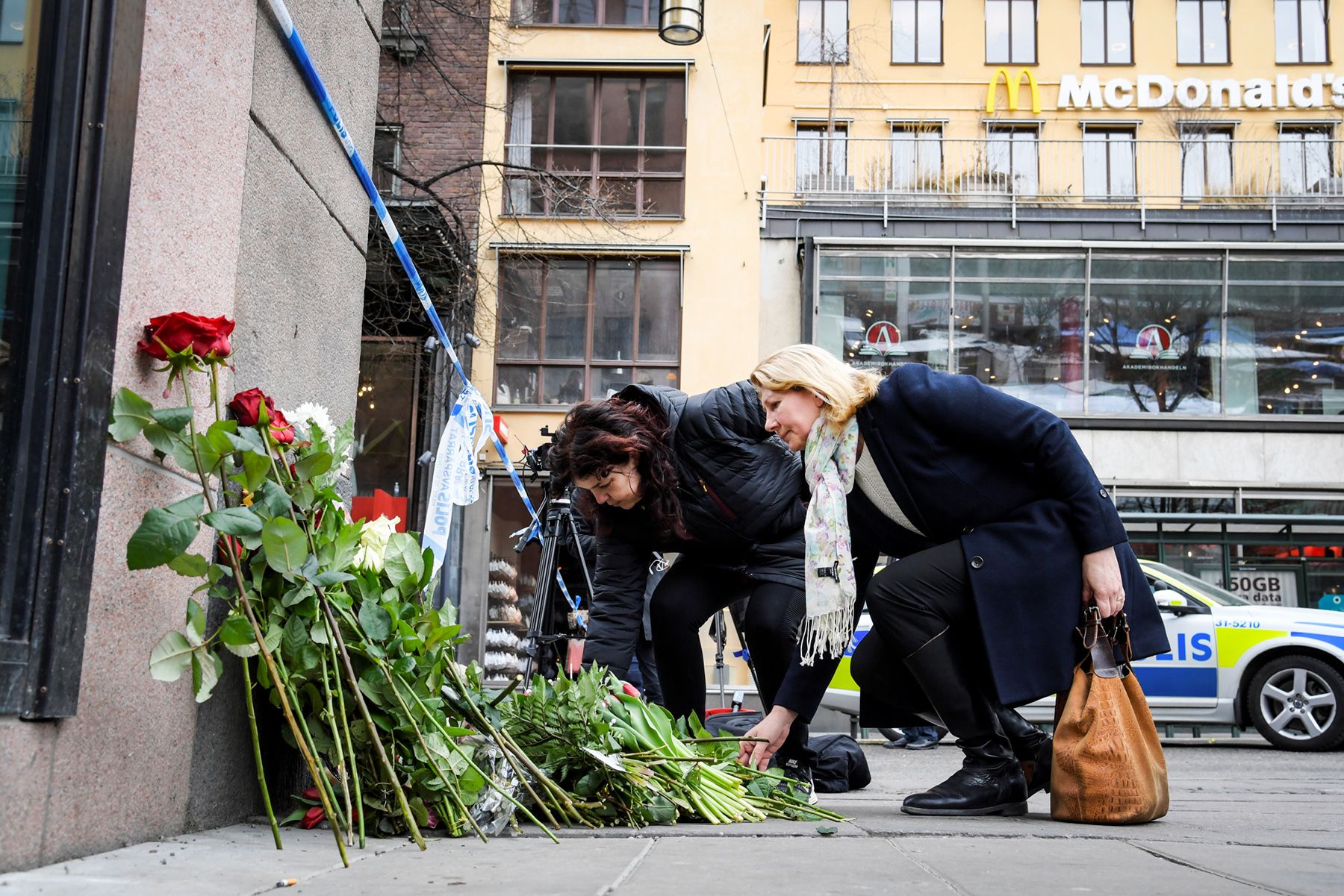 Фото: Anders Wiklund / TT News Agency / Reuters / Scanpix / LETA Люди несут цветы к месту теракта в центре Стокгольма: накануне, 7 апреля, неизвестный на грузовике сбил несколько человек на пешеходной улице в шведской столице и врезался в универмаг. По последним данным, погибли четыре человека, 15 пострадали.