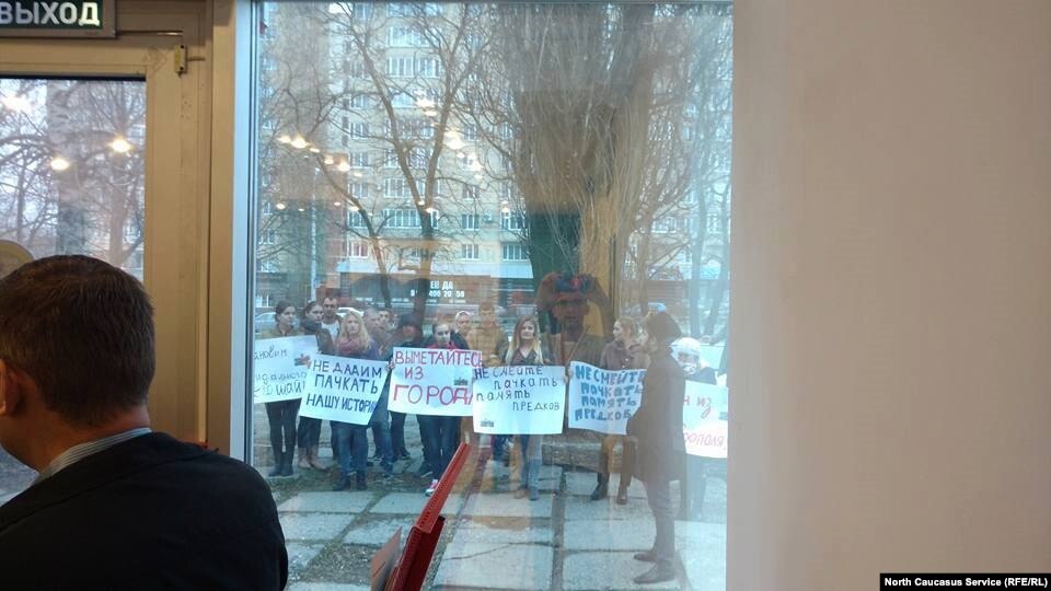 У дверей штаба на улице Лермонтова собрались юноши и девушки, предположительно студенты, с однотипными плакатами: "Прочь из нашей страны", "Не смейте пачкать память предков" и др.