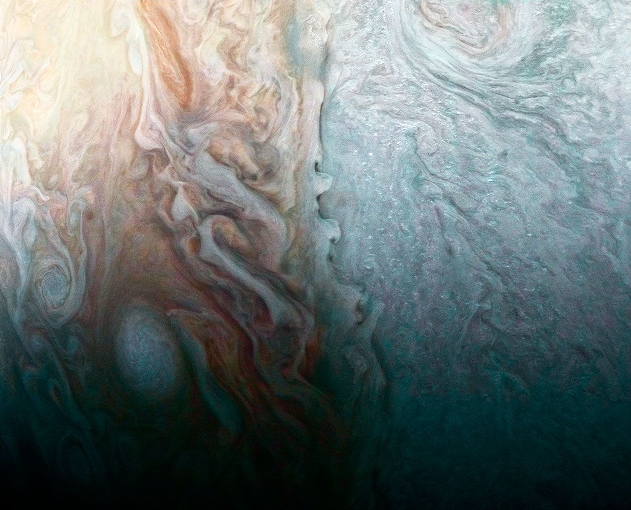 Межпланетный зонд «Джуно» 27 марта пролетел вблизи поверхности Юпитера — и сфотографировал облака газового гиганта с расстояния всего в 12,7 тысячи километров. Конкретное место, которое должен был снять «Джуно», выбирали голосованием: им оказалась область, в которой сходятся разные атмосферные явления.